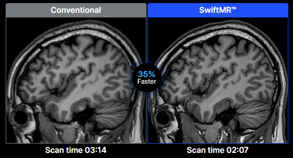 SwiftMR è una soluzione di deep learning che consente di ridurre i tempi delle scansioni MRI, migliorando il comfort del paziente senza compromettere la qualità delle immagini. La soluzione consente ai centri di radiologia di raggiungere nuovi livelli di produttività ed efficienza, poiché tempi di scansione più brevi aumentano il numero di pazienti trattati, aprendo nuove opportunità di guadagno e crescita.